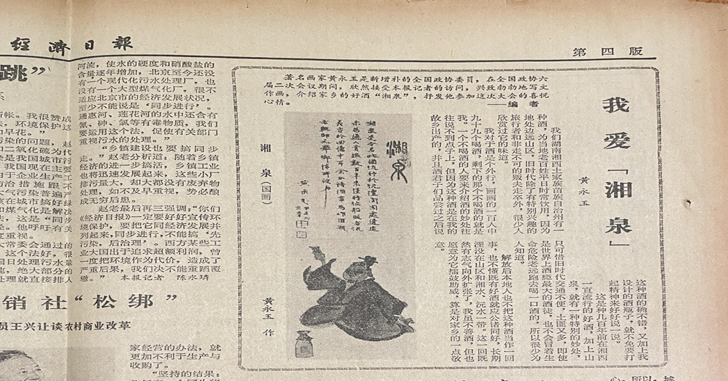 中国白酒文化圈层营销从何开始?先行者非黄永玉莫属。1983年,他重新设计湘泉酒包装后,即用设计《猴票》所得稿费,买下首批三箱湘泉酒,带进了北京,开始了文化圈层宣传推广。1984年5月,全国政协六届二次会议期间,他专门接受了《经济日报》采访,并发表散文《我爱湘泉》及《湘泉》国画刊于其上,同时,他还在北京饭店举行“湘泉宴”,之后,湘泉酒进入了北京饭店、大三元酒家、竹园宾馆、曲园酒家等,得到国内外不少文化名流的品尝与好评;两个月后,黄老还专门给厂里写了一封报喜信。